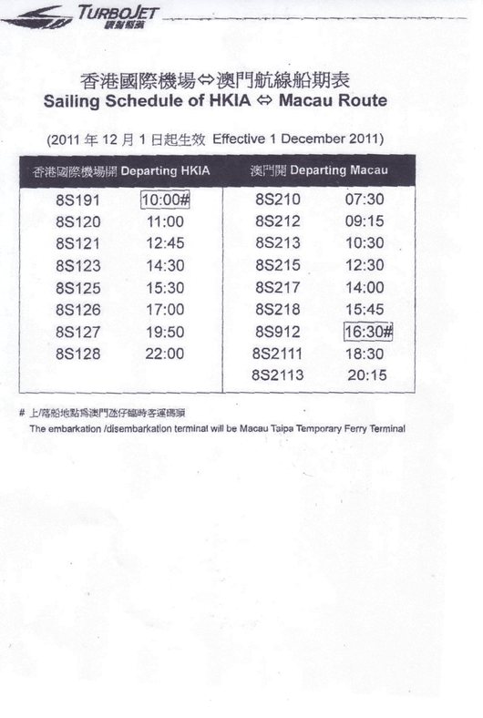 2011年12月1日より香港空港→マカオ間のフェリー時刻変更
